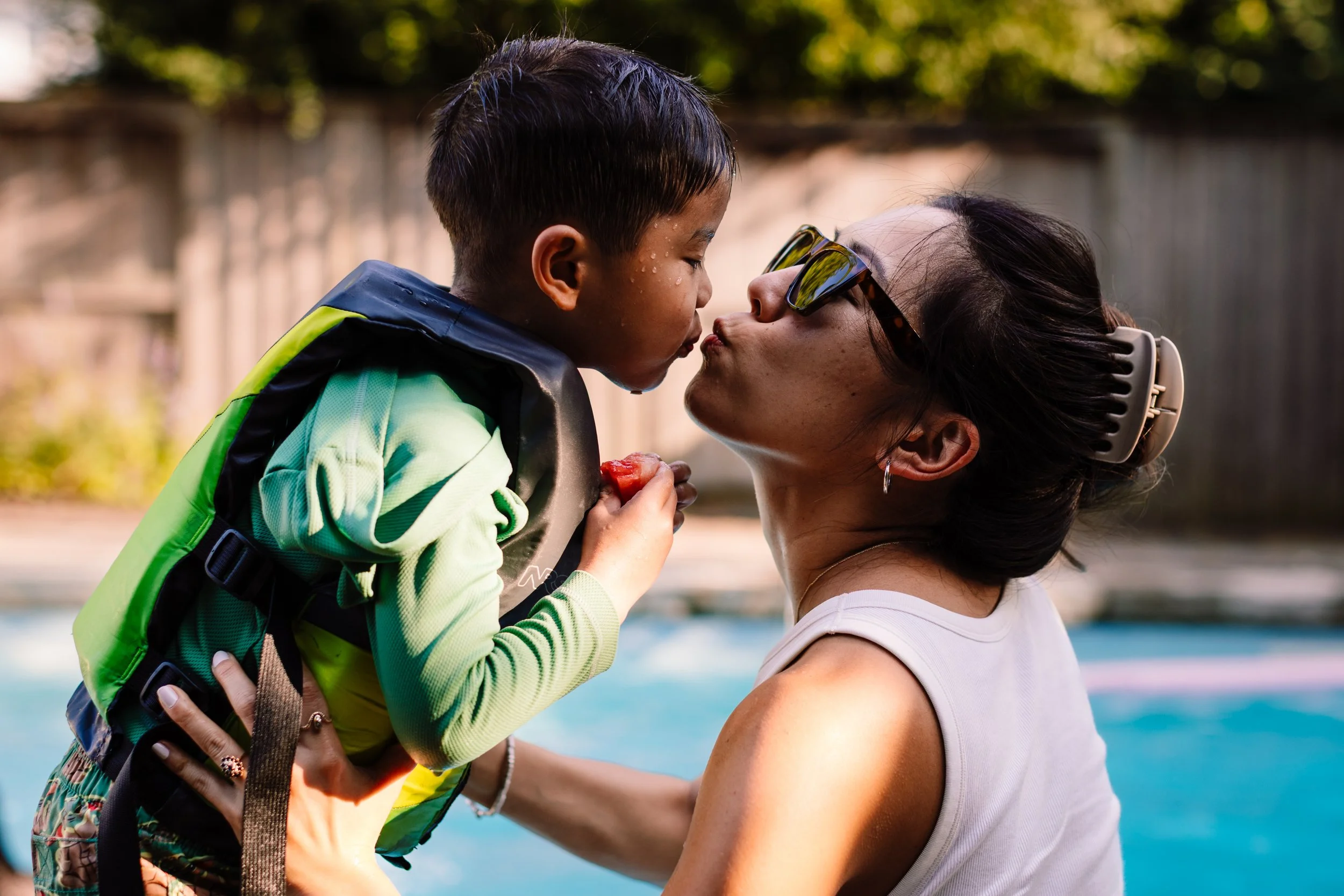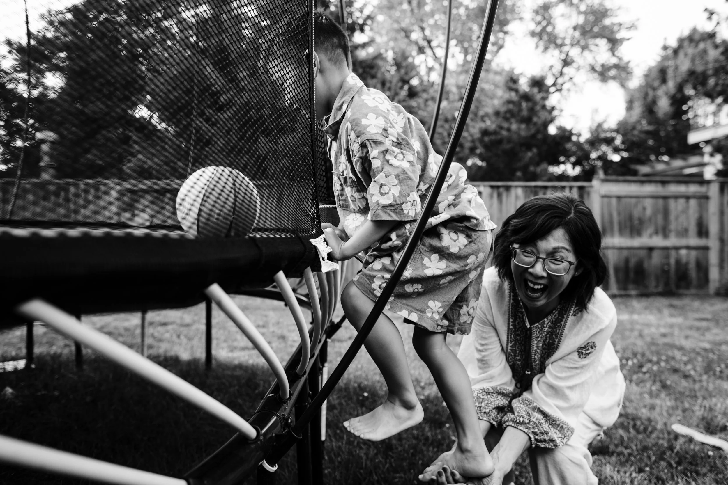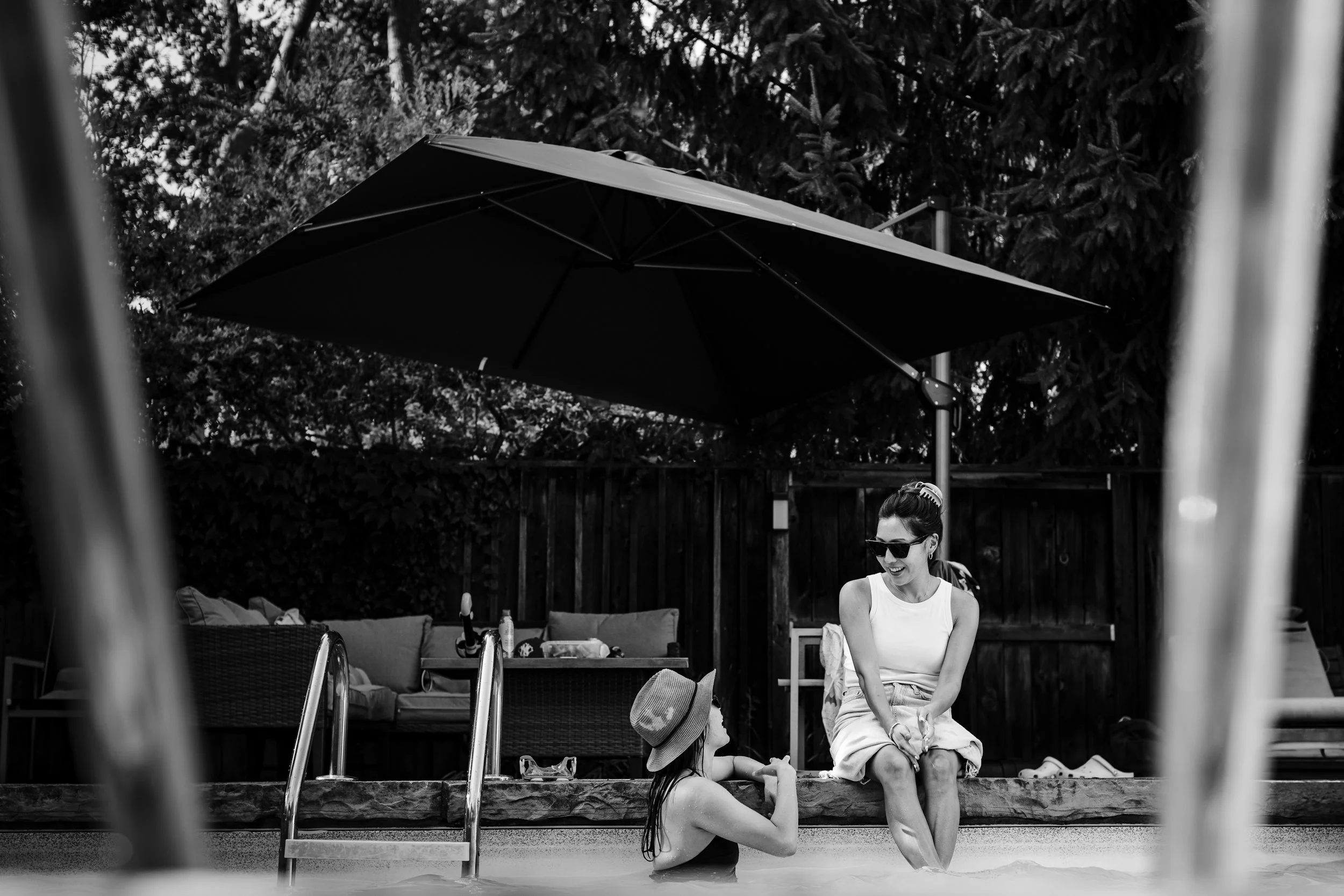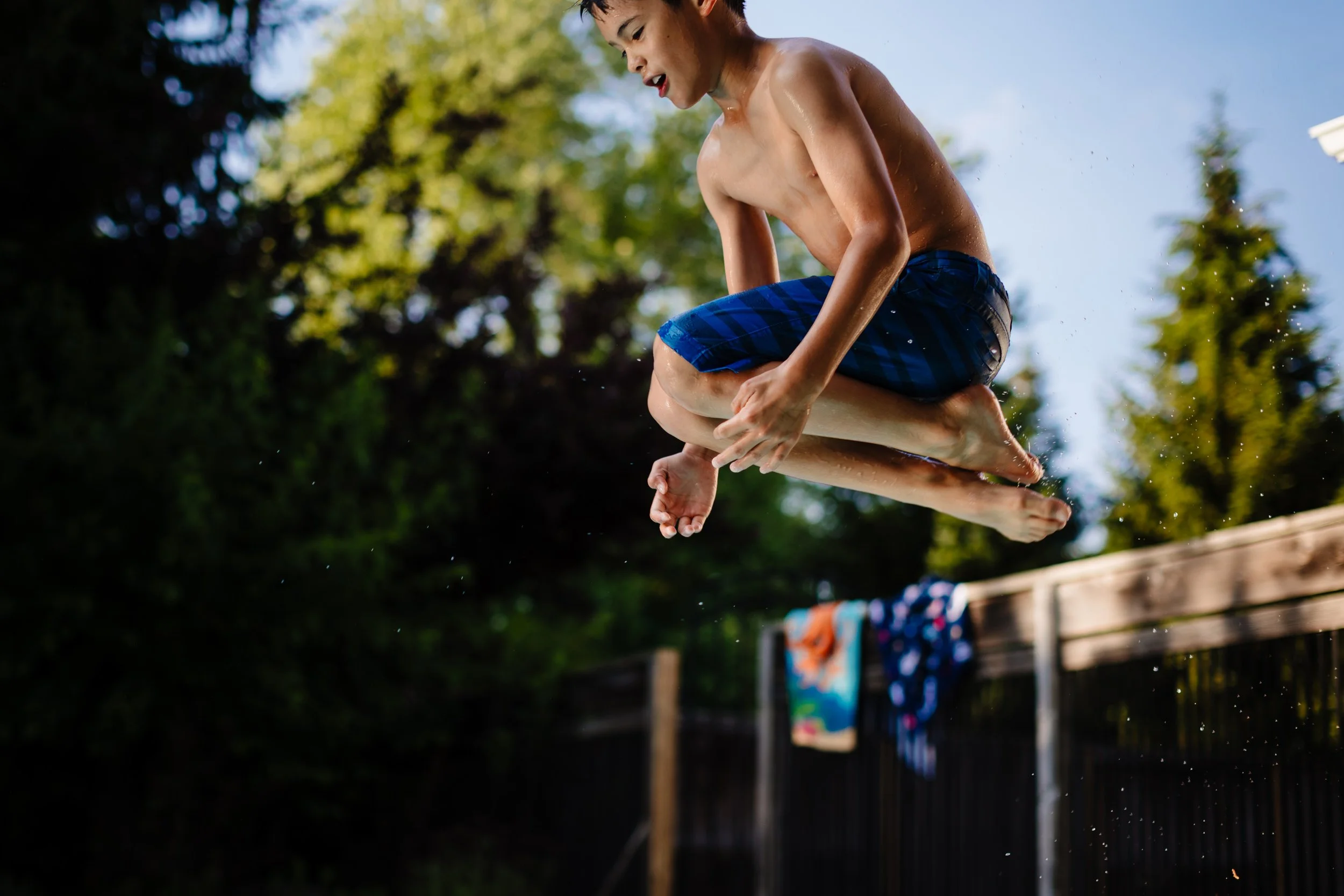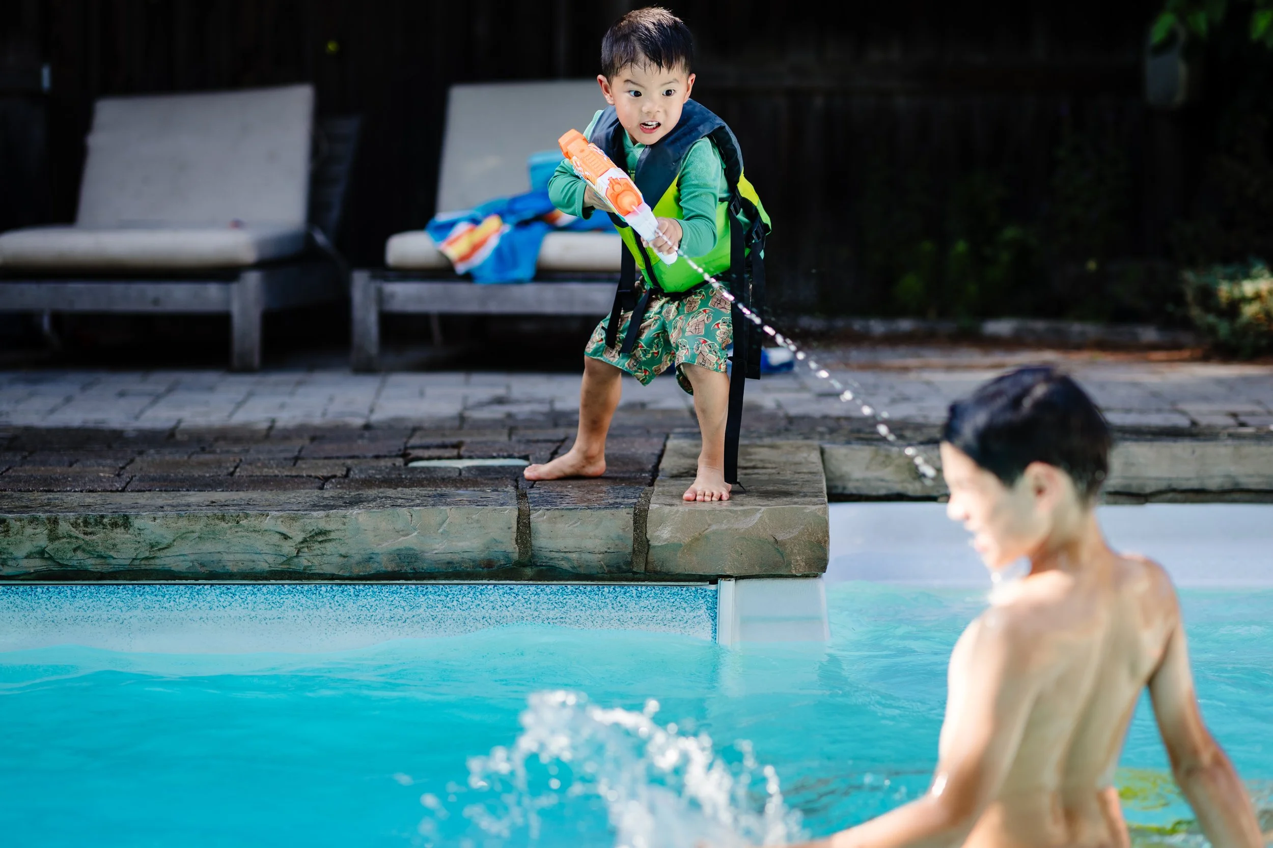 We spent most of the session in the backyard, where the pool quickly became the center of attention. Water guns came out, kids launched themselves into the deep end, and parents joined the fun while the grandparents watched from poolside chairs. Snacks helped tide everyone over until the big family BBQ, and the trampoline made for a perfect break between swim sessions.
