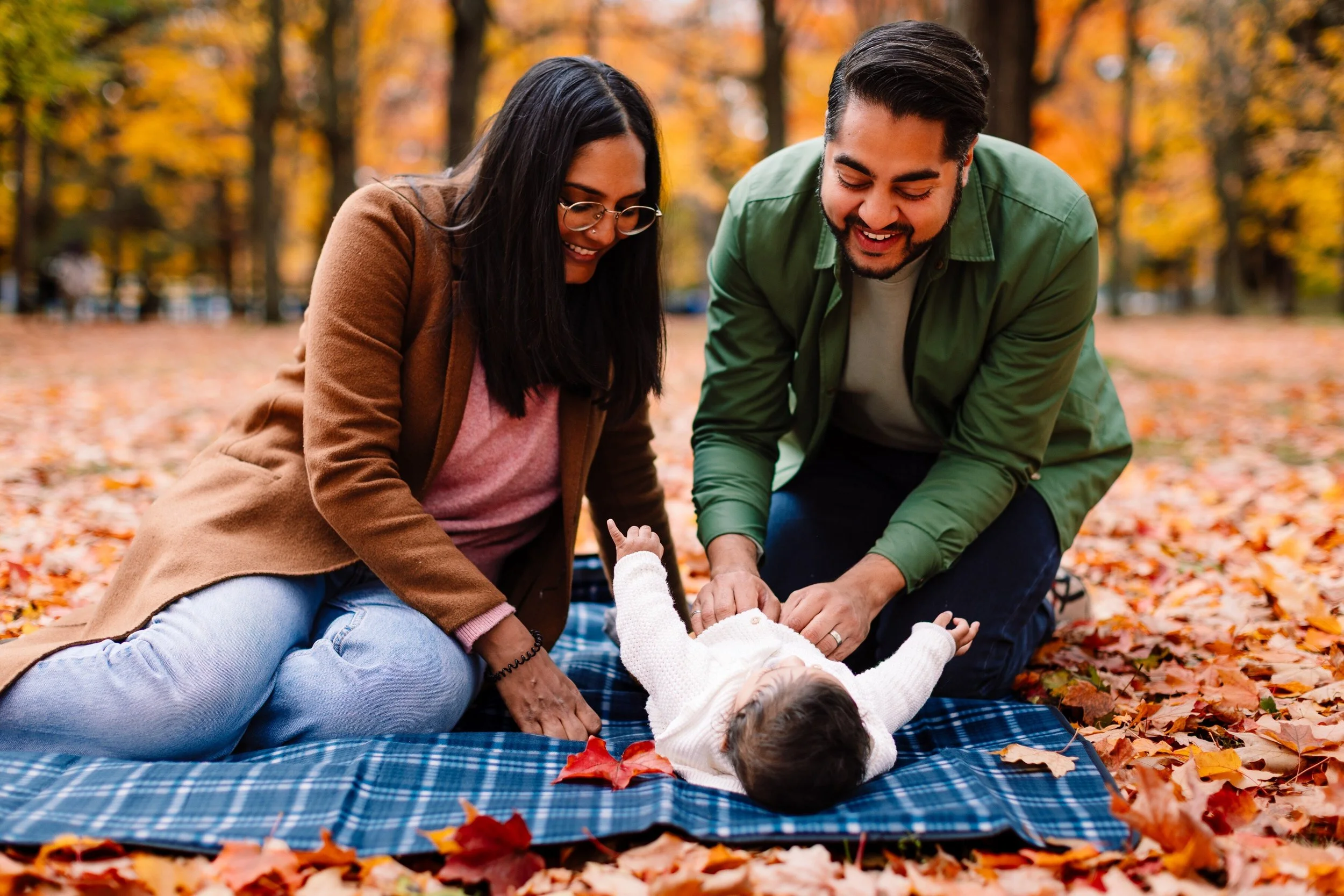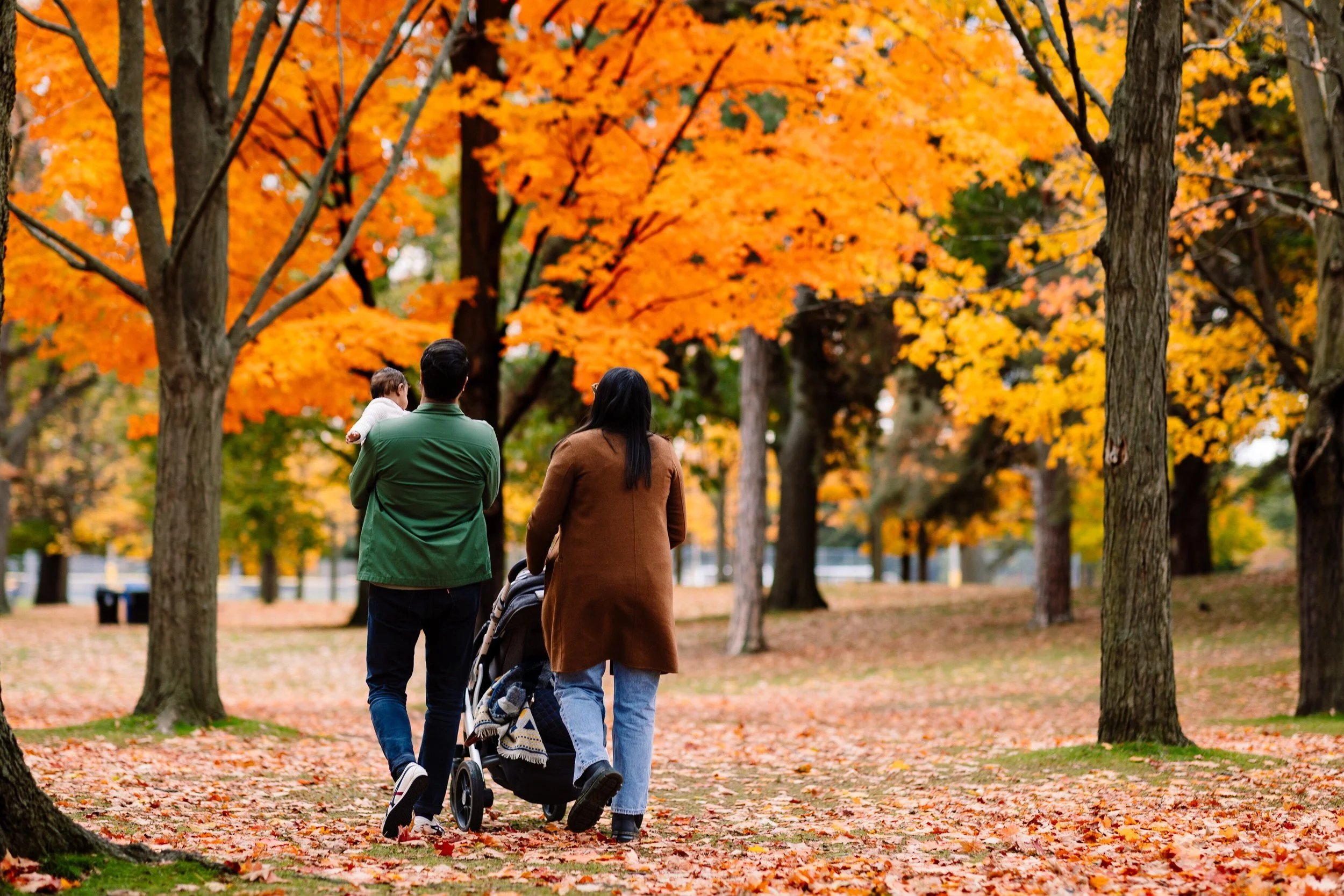Their seven-month-old son was bundled up and curious, fascinated by the rustle of leaves and the abundance of colours. We spent some time exploring different spots in High Park, from tree-lined paths to open patches of orange and gold, capturing the playful, in-between moments that tell a family’s real story.
