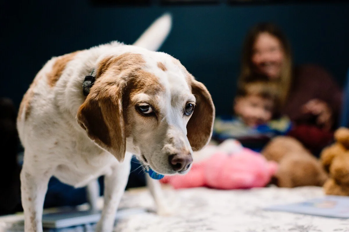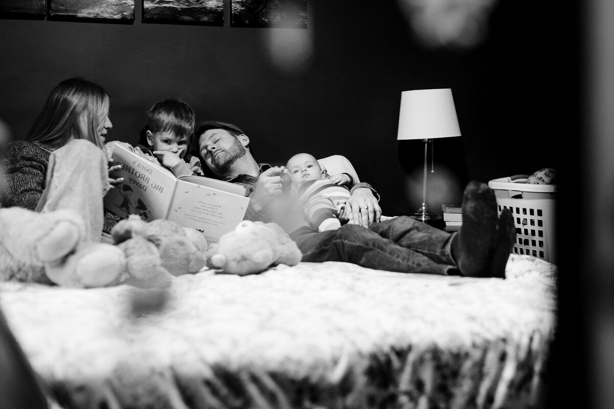 We moved upstairs for a quieter pause — reading together on the parents’ bed, the dog joining in and finding a spot close by. These are the moments that often go undocumented: the slowing down after the chaos..