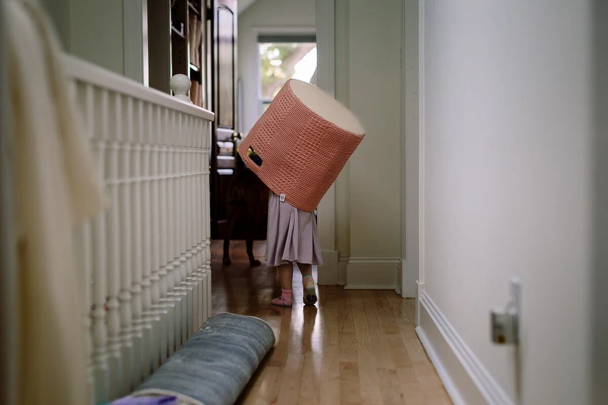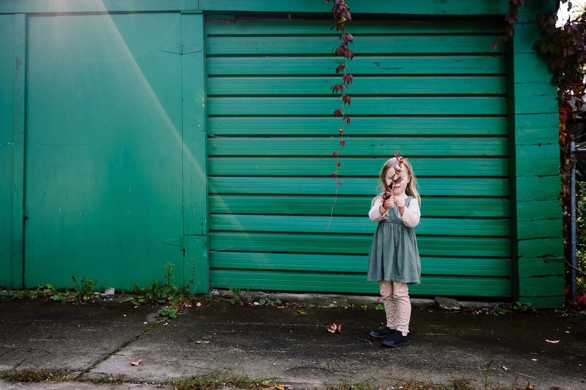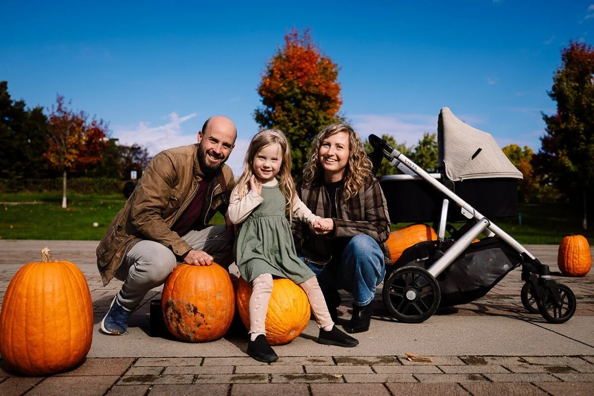 The second session took place four weeks after their youngest daughter was born. It was another crisp morning — but this time, their world felt just a little fuller. The family started off playing outside, with their eldest riding her bike through the alley while the dog bounded nearby. From there, we wandered to Sorauren Park, where the family picked out Halloween pumpkins together. We wrapped up back at home, in their sunlit bedroom, where I photographed the newborn surrounded by soft, morning light.